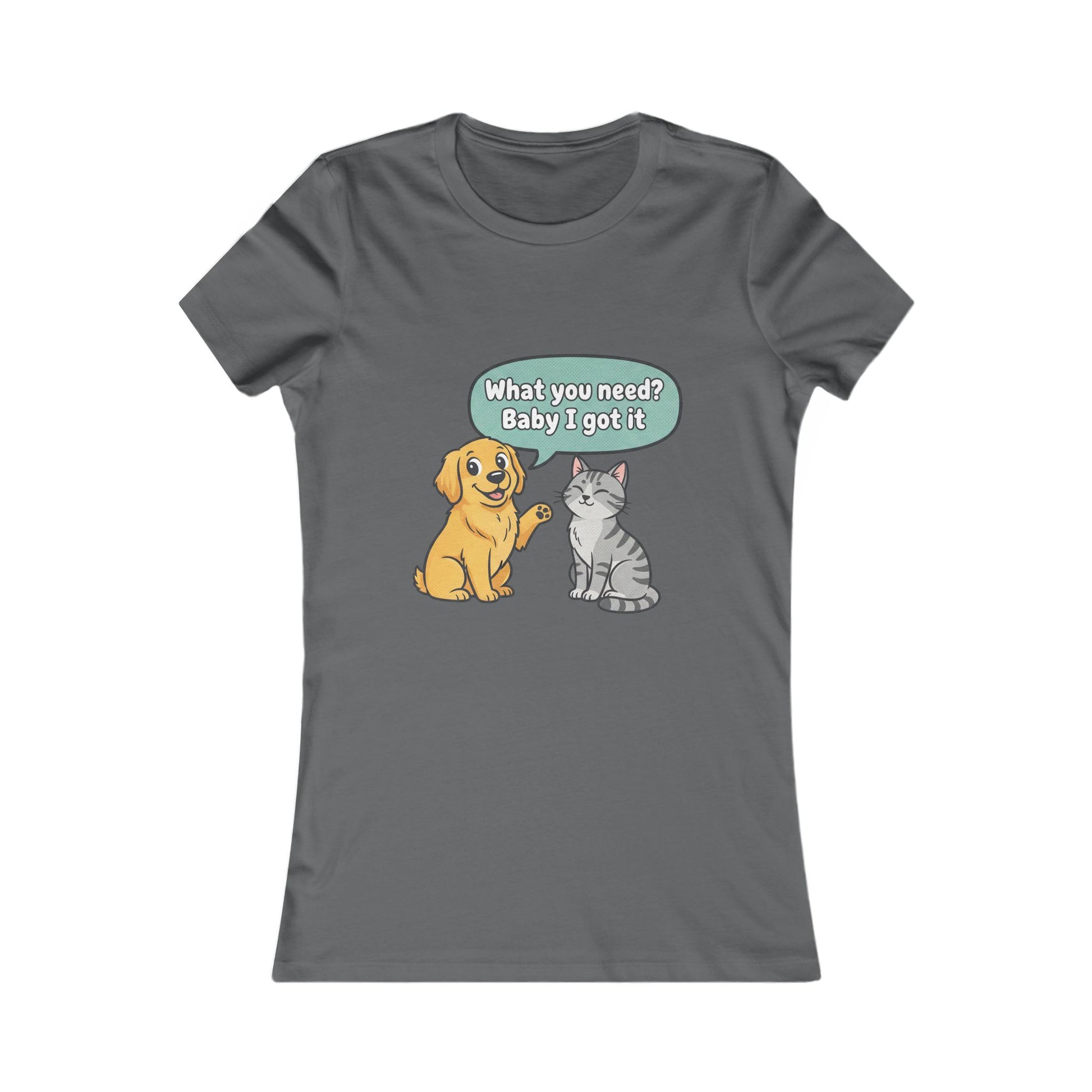 Women’s Tee — Cute Dog & Cat Graphic with “What you need? Baby I got it” Speech Bubble